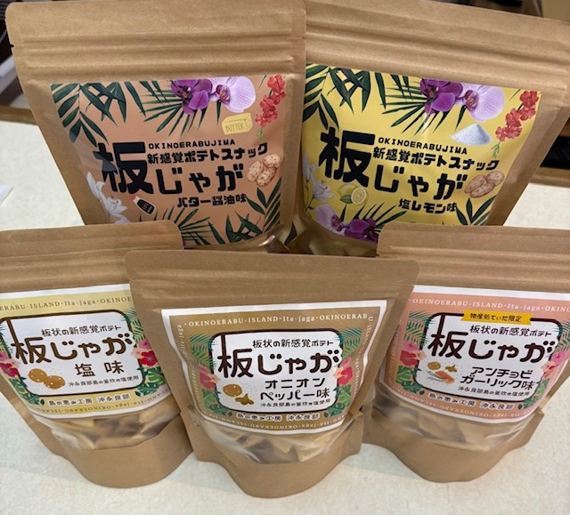 沖永良部島のミネラルたっぷりの赤土で育ったじゃがいもから作られる新感覚ポテトスナック、板じゃが。ポテトチップスとは違う食べ応えのある食感としっかりとじゃがいもを感じる味わいに仕上げています。シンプルに沖永良部島の海塩で味付けしました。