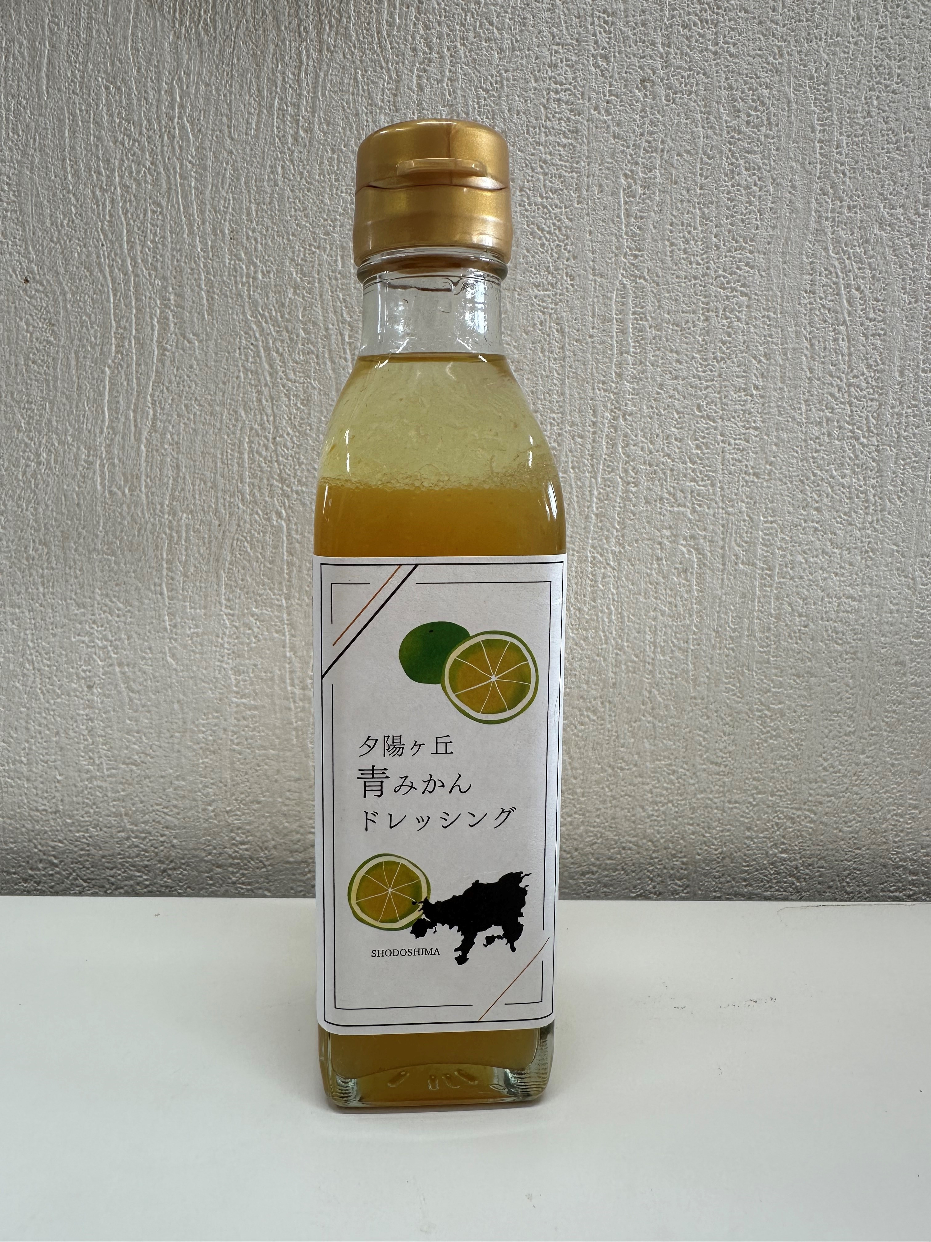 自社のみかん園で間引かれた青いみかんの果汁を使い、小豆島の醤油屋さんに製造していただいたフルーティーなドレッシングです