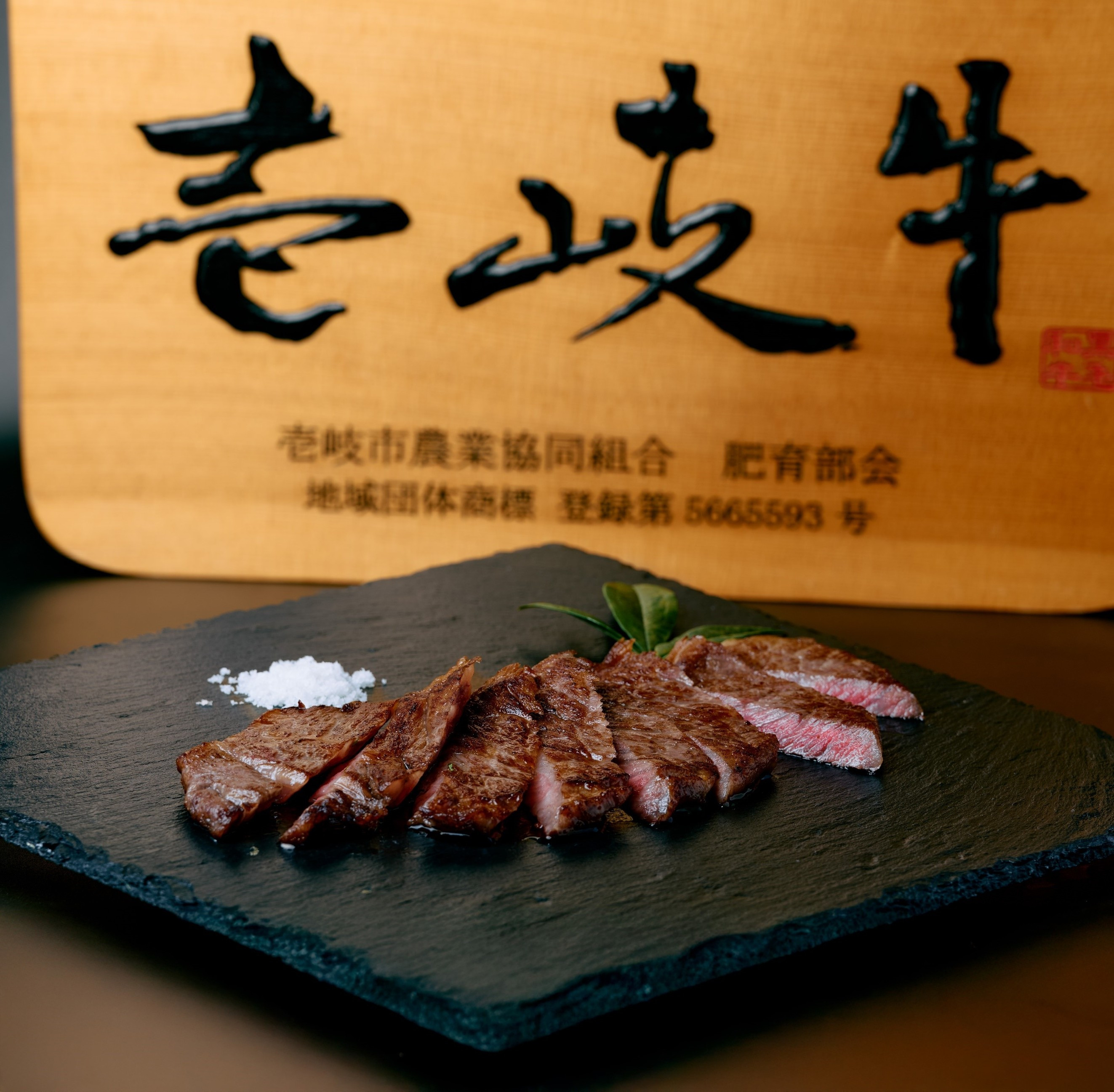 島風に育まれた名牛『壱岐牛』。周りを海に囲まれた島独特の島風が、飼料の牧草に適度な塩分を与えています。そのミネラルたっぷりの牧草を食べて育った壱岐牛は、肉質は柔らかく、しつこすぎない霜降りとなっています。